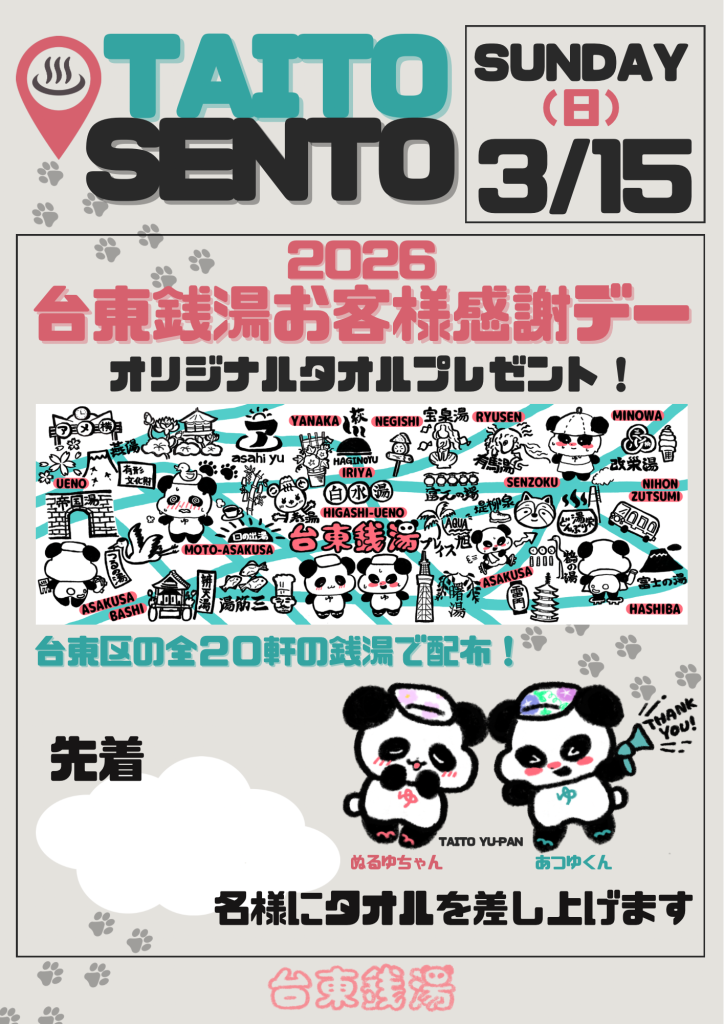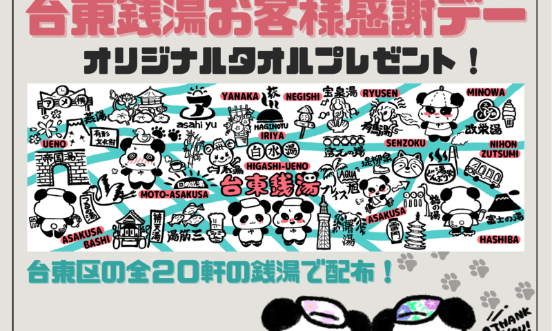 3月15日(日曜日)はお客様感謝デー。台東区の浴場で記念タオルを先着でお配りします。各浴場で配布枚数や配布条件が異なりますのでご注意ください。